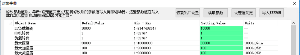 最大加減速度、Jog點動參數(shù)、回零參數(shù)等都可通過ServoSoftStudio中的對象字典編輯器設(shè)置。