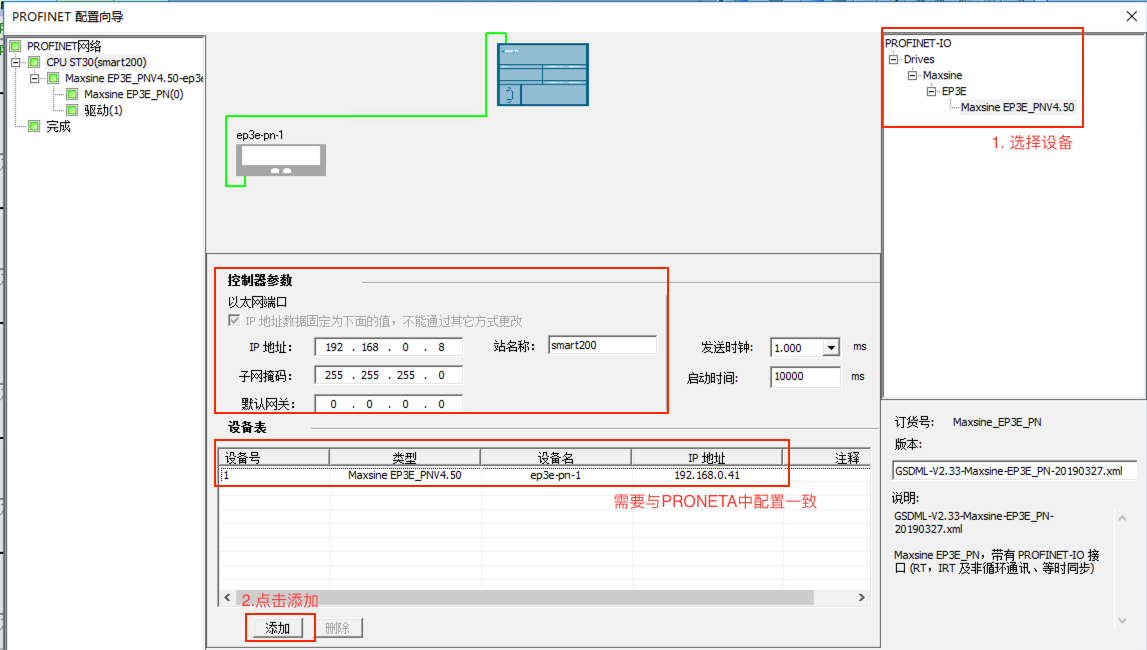 4. 設(shè)置PLC的IP,添加EP3E設(shè)備,并設(shè)置IP與設(shè)備名稱,此處的設(shè)置需要與之前PRONETA工具設(shè)置的一致,之后點擊下一步;