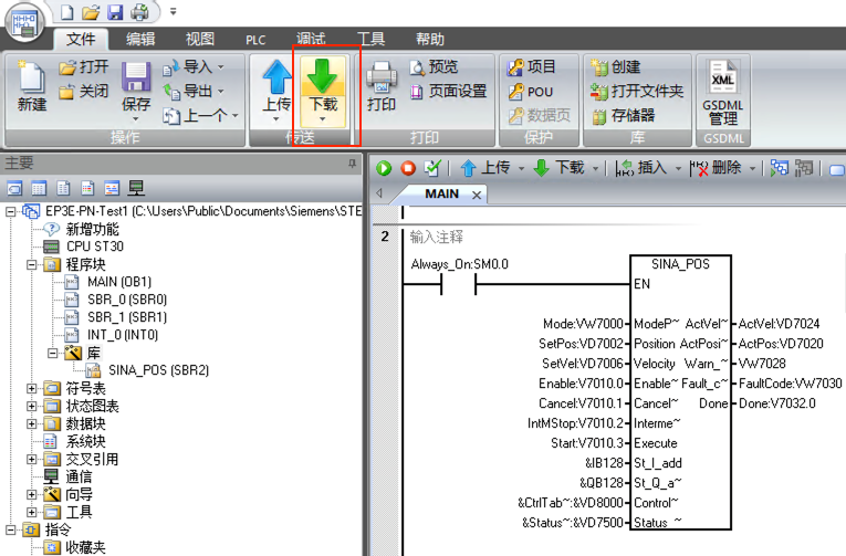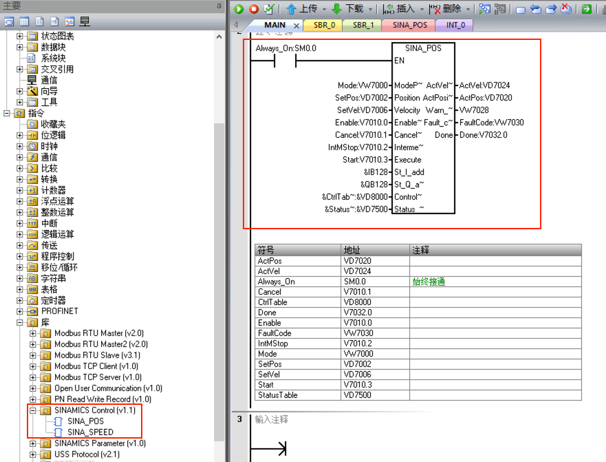 7. 主程序中編寫程序,SINA_POS功能塊的St_I_add和St_Q_add的地址與步驟5中111報文的輸入輸出地址對應(yīng)
