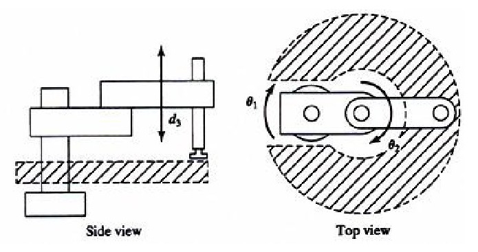 SCARA機(jī)器人常用于裝配作業(yè),最顯著的特點(diǎn)是它們?cè)趚-y平面上的運(yùn)動(dòng)具有較大的柔性,而沿z軸具有很強(qiáng)的剛性,所以,它具有選擇性的柔性。這種機(jī)器人在裝配作業(yè)中獲得了較好的應(yīng)用。