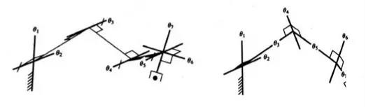 通常空間定位需要6個(gè)自由度,利用附加的關(guān)節(jié)可以幫助機(jī)構(gòu)避開(kāi)奇異位形。下圖為7自由度操作臂位形。