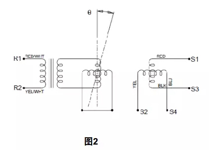 與編碼器類似,旋轉(zhuǎn)變壓器也是將機(jī)械運(yùn)動(dòng)轉(zhuǎn)化為電子信號(hào)的轉(zhuǎn)動(dòng)式機(jī)電裝置。但與編碼器不同的是,旋轉(zhuǎn)變壓器傳輸?shù)氖悄M信號(hào)而非數(shù)字信號(hào)。基本組成方面,旋轉(zhuǎn)變壓器由1個(gè)一次繞組和2個(gè)相位在機(jī)械上成90°的二次繞組組成,見圖2所示。旋轉(zhuǎn)變壓器的輸出信號(hào)需要控制器能夠轉(zhuǎn)換模擬信號(hào)的信號(hào)輸入電路。