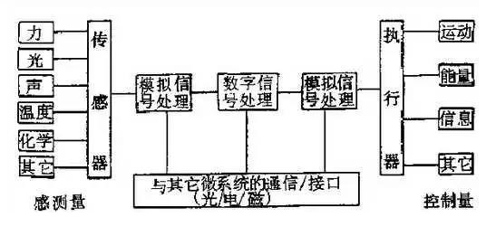 MEMS簡單來說就是將傳統(tǒng)傳感器的機(jī)械部件微型化后,和其他元件如微執(zhí)行器和微電子器件組成的集成體。雖說如此,MEMS并不像編碼器一樣必須要有電路板、碼盤等固定元件,其高集成度特點(diǎn)可以根據(jù)不同的工控場合進(jìn)行任意元件的組合,而典型的MEMS系統(tǒng)如下圖所示: