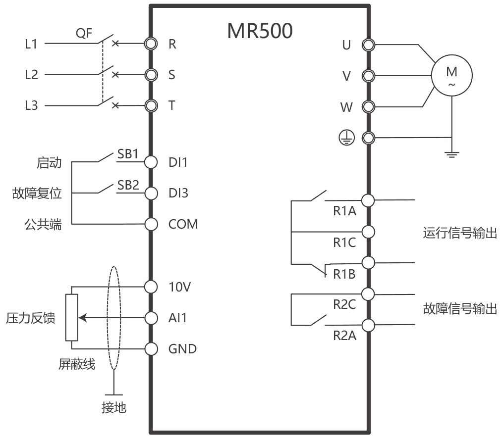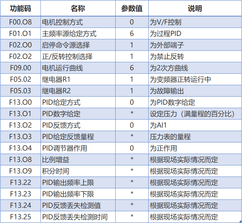 在主要功能預(yù)置方面,最高頻率應(yīng)以電動機(jī)的額定頻率為變頻器的最高工作頻率。升、降速時(shí)間在采用變頻器內(nèi)置PID調(diào)節(jié)。升、降速時(shí)間應(yīng)盡量設(shè)定得短一些,以免影響由PID調(diào)節(jié)器決定的動態(tài)響應(yīng)過程。控制原理如下: